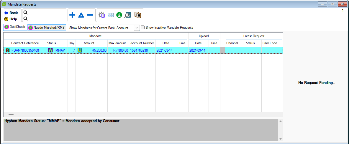 DebiCheck mandate request window: -Existing mandates can now be changed -Added "Existing Mandate" field when changing a mandate which allows a user to make changes to a specific active mandate -Added "Channel", "Frequency" and "Type" fields to the "Mandate Detail At Hyphen" section