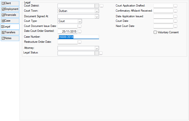Consultants - Fixed bug where inactive users could be selected when inserting/updating the client's consultants When running bureau Check, if previous Bureau check was successful for the client, the client ID field will no longer be required Added Legal tab and moved all court dates and related fields to that tab ·Statutory Deductions (total deductions with category "Statutory Deduction") ·Employer Deductions (total deductions with category "Employer Deduction") ·Income (total income with category "Income") ·Other Income (total income with category "Other Income") ·Household Expenditure (total expenses with category "Household Expense") ·Financial Expenditure (total expenses with category "Financial Expense") ·Excluded PDA Expense (total unproposed expenses) ·Mail Merge - Added new fields: ·Added Note field on expenses ·Added Revised amounts for all budget records ·Added Categories for all budget records §Mail Merge - Added New fields: Obligation Table: Current Balance CF Current Balance CF Date Current Balance BF Current Balance BF Date.