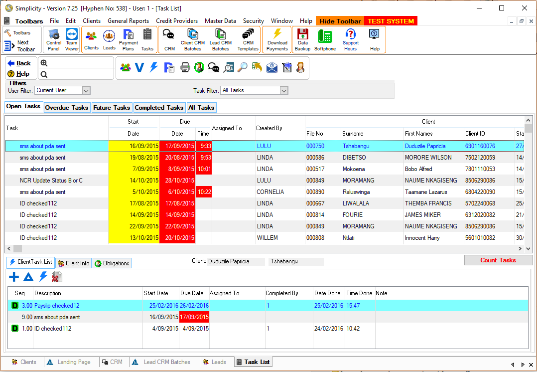 ·A client's file, obligations and payment plan for the associated task can also be accessed from this window.